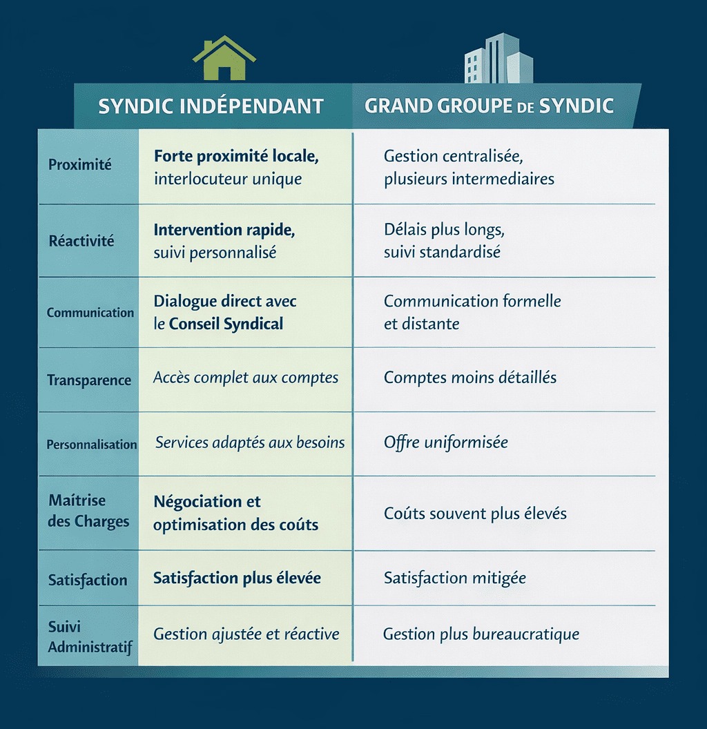 Dans ce contexte local exigeant, l’administrateur de copropriété (le syndic) ne se limite pas à un rôle administratif : il est un acteur central de la gestion financière, juridique et technique de l’immeuble. Le choix entre un grand groupe national et un syndic indépendant à taille humaine devient alors une décision stratégique, aux conséquences directes sur la maîtrise des charges, la transparence de la gestion, la qualité du suivi et, à long terme, la valorisation du patrimoine immobilier.